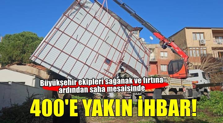 İzmir’de dün etkili olan yağış ve fırtınanın ardından İzmir Büyükşehir Belediyesi’ne 400’e yakın ihbar ulaştı. Olumsuz hava koşulları nedeniyle bazı bölgelerde su baskınları meydana geldi. Çatılar uçtu, ağaçlar devrildi. Afet İşleri Dairesi Başkanlığı Afet Koordinasyon Merkezi (AKOM) Şube Müdürlüğü koordinasyonunda belediyeye bağlı tüm birimler olumsuz hava koşullarının etkilerine karşı sahada görev yaptı.