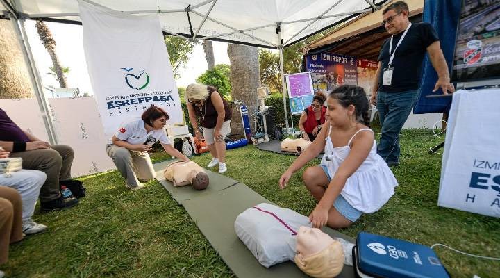 94. İzmir Enternasyonal Fuarı’nda yerini alan Türkiye’nin ilk ve tek belediye hastanesi İzmir Büyükşehir Belediyesi Eşrefpaşa Hastanesi, fuar ziyaretçilerine ilkyardım eğitimleri verdi. Hastane dışında gerçekleşen ani kalp durması vakalarında hayati önem taşıyan kalp masajı uygulaması, 90 saniye gibi kısa bir sürede stant ziyaretçilerine uzman hekimler ve hemşireler tarafından uygulamalı olarak anlatıldı. Aynı zamanda Acil Tıp Uzmanı olan Eşrefpaşa Hastanesi Başhekimi Doç. Dr. Başak Bayram, İzmir Büyükşehir Belediyesi tarafından şehrin farklı noktalarına yerleştirilmesi planlanan otomatik elektroşok cihazını da tanıttı. İlk müdahale sırasında başarı oranını artıracak cihaz, ani kalp durma vakalarında vatandaşlar tarafından sesli komut desteği sayesinde rahatlıkla kullanılabilecek.
