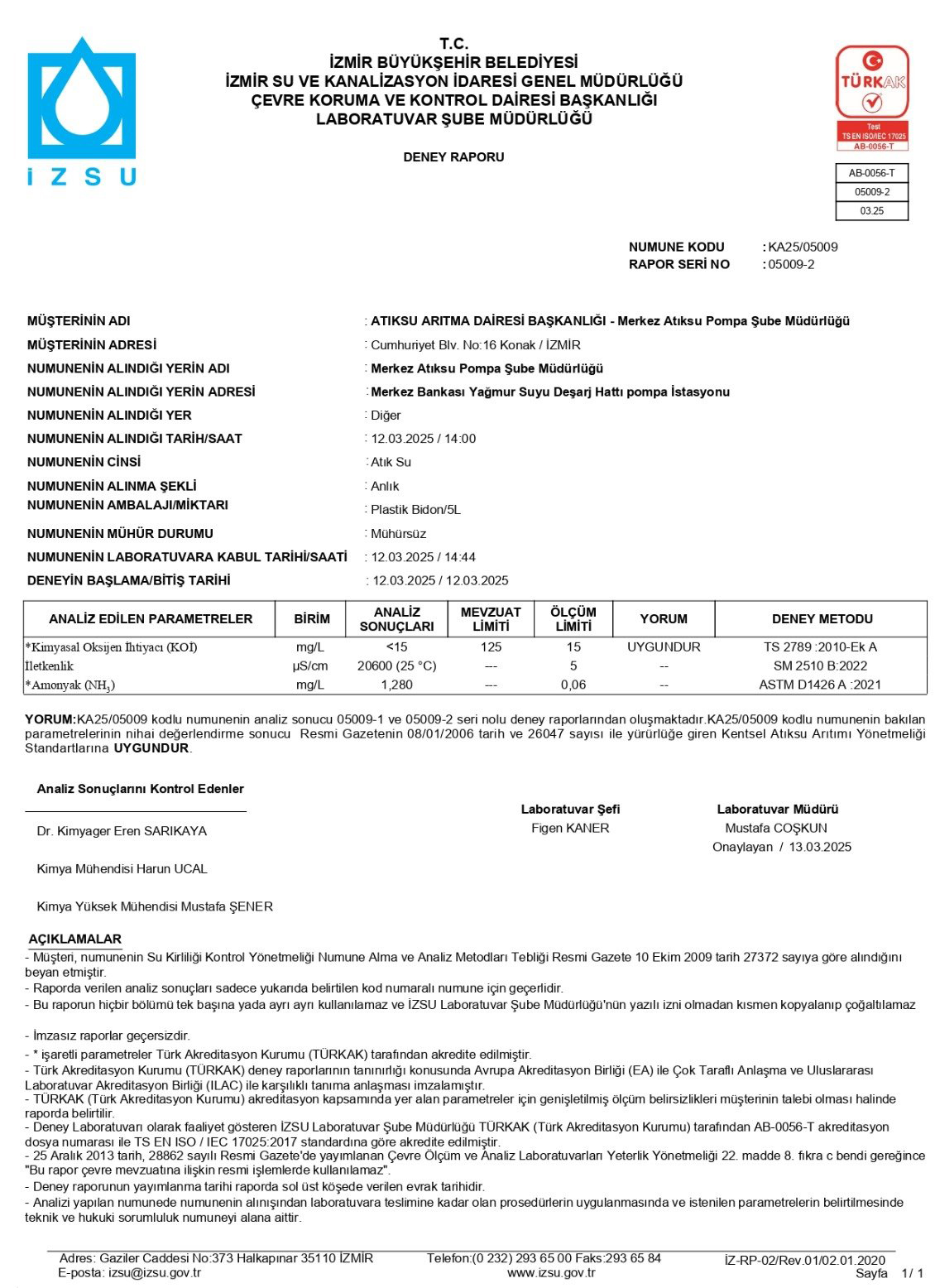 İzmir Büyükşehir Belediyesi İZSU Genel Müdürlüğü Çevre Koruma ve Kontrol Dairesi Başkanlığı Laboratuvar Şube Müdürlüğü’nün Türk Akreditasyon Kurumu (TÜRKAK) tarafından akredite edilen laboratuvarlarında yapılan analizler, görüntülere yansıyan suyun evsel atık değil, yağmur suyu standartlarında olduğunu ortaya koydu.