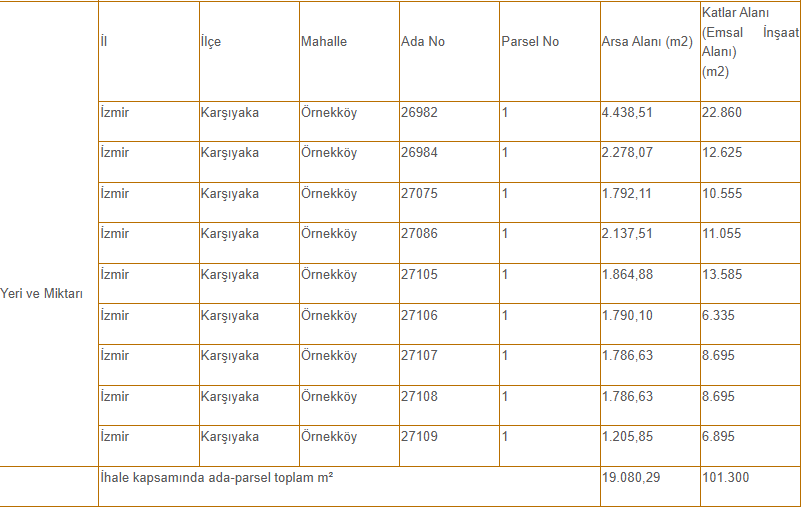 Toplamda 9 parselde yapılacak kat karşılığı inşaat yapım ihalesi kapalı teklif usulüyle 9 Nisan 2026 saat 12.00'de İzmir Büyükşehir Belediyesi Başkanlığı Encümen Toplantı Odası'nda gerçekleştirilecek.