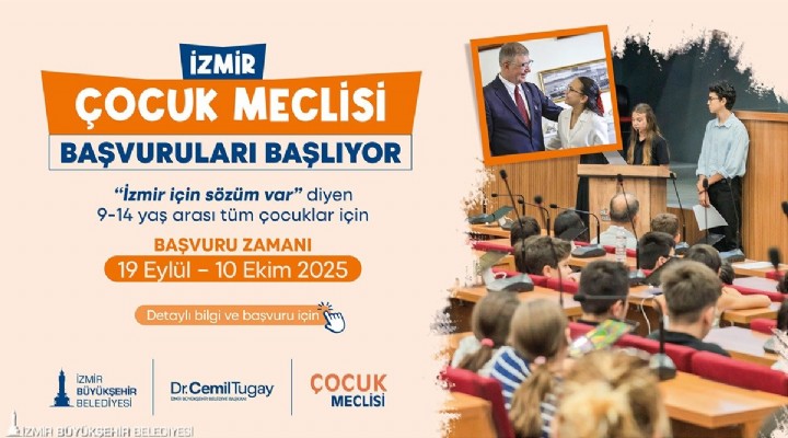 İzmir Büyükşehir Belediyesi Kadın ve Aile Hizmetleri Dairesi Başkanlığı Çocuk Çalışmaları Şube Müdürlüğü tarafından sürdürülen çalışmalar kapsamında, İzmir Çocuk Meclisi’nin yeni dönem başvuruları 19 Eylül’de başlıyor. İzmir’de yaşayan 9-14 yaş arası tüm çocuklar, 19 Eylül - 10 Ekim tarihleri arasında, https://www.izmir.bel.tr/ ve https://www.bizizmir.com/ internet sitelerinde yer alan başvuru formunu doldurarak veya kentin çeşitli noktalarında yer alan duyuru afişlerindeki QR kodu okutarak başvurularını yapabilecek. İnternet erişimi olmayan çocuklar İzmir’in çeşitli noktalarında faaliyet gösteren İzmir Çocuk Merkezlerinden başvuru ekranına erişebilecek.