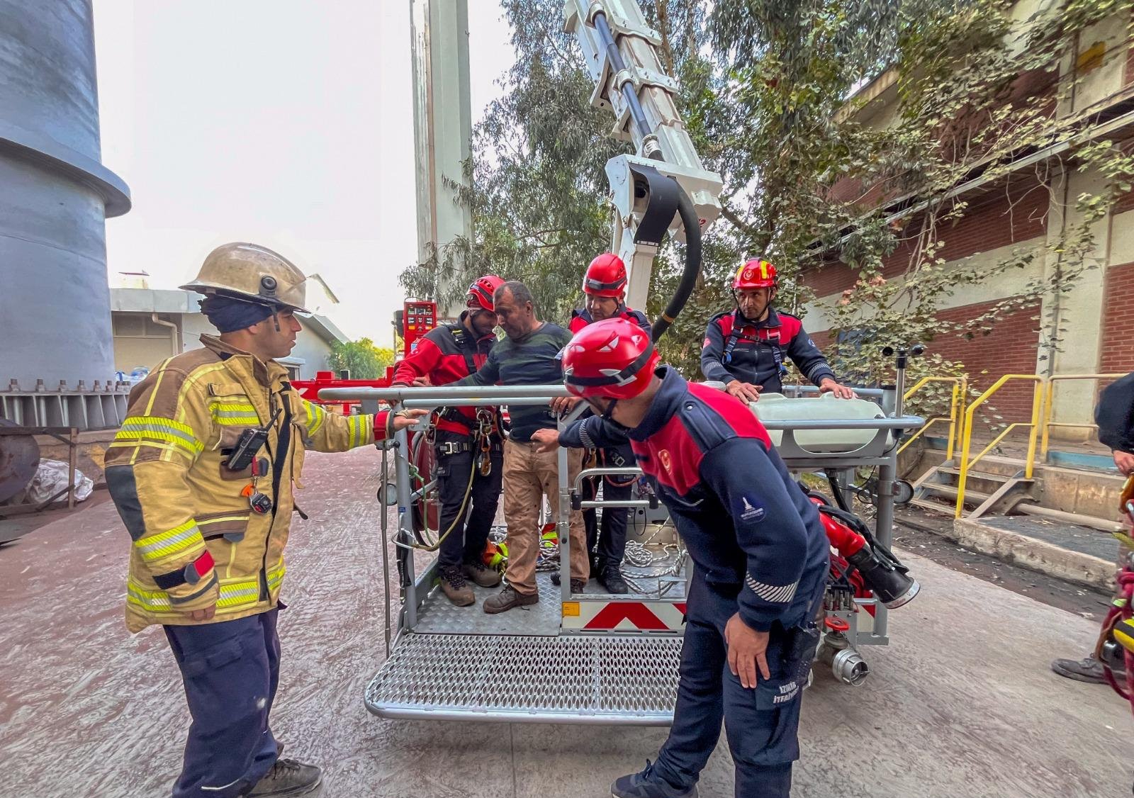 Bornova’da Ankara Caddesi üzerinde bulunan bir çimento fabrikasına ait 70 metre yüksekliğindeki bacaya temizlik amacıyla çıkan 2 işçi, iskelenin çökmesi sonucu yaklaşık 10 metre aşağıya düşerek baca içerisinde mahsur kaldı. Olayın ihbar edilmesi üzerine bölgeye İzmir Büyükşehir Belediyesi İtfaiye Dairesi Başkanlığı ve AFAD ekipleri sevk edildi. Ekipler, 90 metrelik merdivenli araçla bacanın üst kısımlarına doğru çıkarak işçilere ulaştı. Ekipler, yaklaşık dört saatlik titiz ve kontrollü çalışmaların ardından işçileri mahsur kaldıkları yerden kurardı. Sağlık durumlarının iyi olduğu belirlenen işçiler, tedbir amacıyla 112 Acil Sağlık ekiplerine teslim edildi.