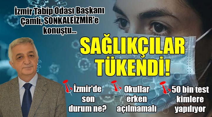 İzmir Tabip Odası Başkanı Lütfi Çamlı, koronavirüs salgını ile mücadelenin en ön safındaki sağlıkçıların tükenme noktasına geldiğini söyledi. SONKALEİZMİR'e konuşan Çamlı, "Salgın sürecinin uzaması, vakaların sürekli artıyor olması, ekonomik olarak emeklerinin karşılığını alamamaları bedenen ve psikolojik olarak sağlıkçıları tükenme noktasına getirdi. Onları dinlendiremezsek, bu savaşı kaybederiz" dedi. Çamlı, İzmir'deki durumla ilgili de önemli açıklamalarda bulundu