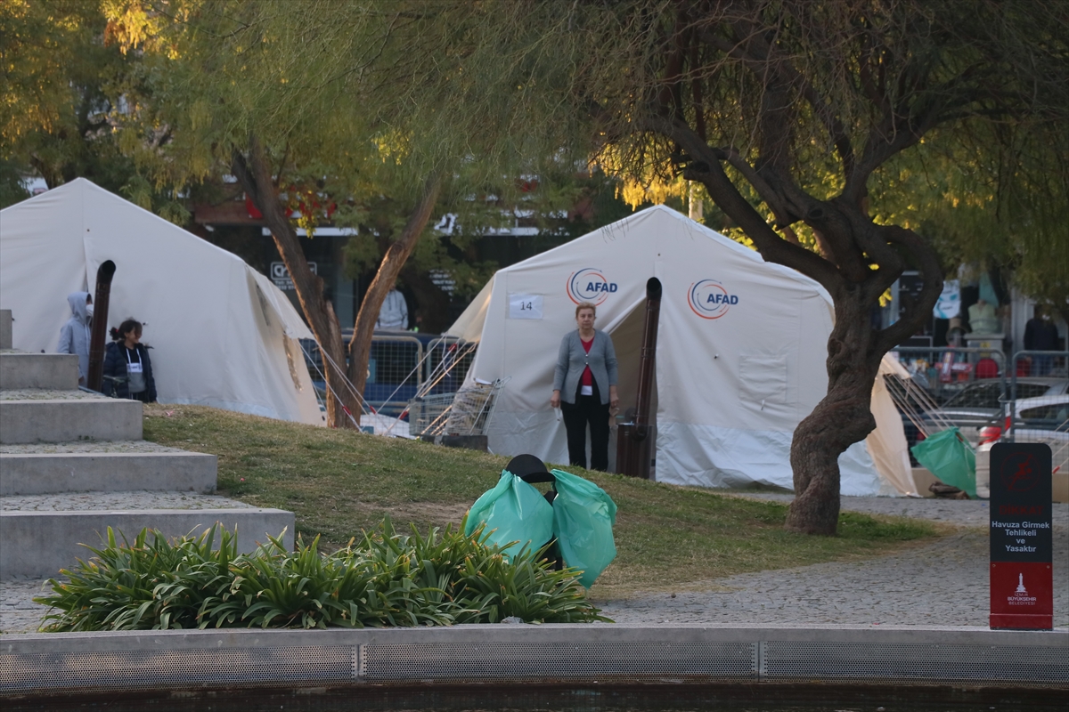 Bayraklı 75. Yıl Parkı içinde oluşturulan çadır alanında da vatandaşlar, Atatürk büstü önünde toplandı. Ellerinde Türk bayraklarıyla saygı duruşuna depremzedeler, büste çiçek bıraktı. Saat 09.05'de kentte trafik dururken, araçlarından inen vatandaşlar korna çalarak sirene eşlik etti.
