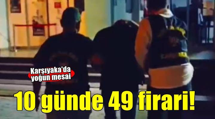 Karşıyaka İlçe Emniyet Müdürlüğü ekipleri tarafından, 05-15 Mayıs tarihleri arasında çeşitli suçlardan aranan firari hükümlülerin yakalanmasına yönelik çalışma yaptı. Çalışmalarda, 'uyuşturucu satmak' suçundan 9 yıl 6 ay 27 gün hapis cezası ile aranan Ö.Ş. (31) aynı suçtan 7 yıl 8 ay 22 gün hapis cezası ile aranan E.Ç. (22) ve 5 yıl 6 ay 20 gün hapis cezası ile aranan T.Y. (27) , 'hırsızlık' suçundan 9 yıl 9 ay 20 gün hapis cezası ile aranan E.İ. (25), 'nitelikli cinsel saldırı' suçundan 8 yıl 4 ay hapis cezası ile aranan S.Ç.'nin (48) de aralarında bulunduğu toplam 49 firari hükümlü yakalandı. Yakalanan firari hükümlüler, polis merkezlerinde ifadeleri alındıktan sonra adli makamlara sevk edildi.