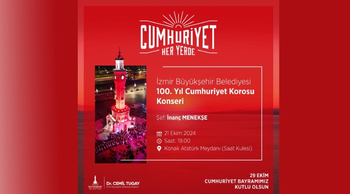 İzmir Büyükşehir Belediyesi, 29 Ekim Cumhuriyet Bayramı kutlamalarını “Cumhuriyet Her Yerde” programı ile il geneline yayıyor. Bu kapsamda Konak Atatürk Meydanı, Kültür ve Sanat Dairesi Başkanlığı organizasyonunda önemli bir konsere ev sahipliği yapacak. İzmir Büyükşehir Belediyesi 100. Yıl Cumhuriyet Korosu, 100 kişilik koro üyesi ve 20 kişilik orkestrası ile 21 Ekim günü saat 19.00’da şef İnanç Menekşe yönetiminde sahneye çıkacak. Türk marşları ve Cumhuriyet dönemini yansıtan repertuvarın yer alacağı konserde, Cumhuriyet kazanımları vurgulanacak.