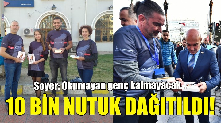 İzmir Büyükşehir Belediyesi’nin ulu önder Mustafa Kemal Atatürk’ün vefatının 84’üncü yıl dönümü için hazırladığı anma programı kapsamında yurttaşlara 10 binin üzerinde Nutuk kitabı dağıtıldı. “Kurduğun Gelecek Bize Emanet” sloganıyla İZELMAN tarafından bastırılan Mustafa Kemal Atatürk’ün Nutuk kitabı sabah saat 08.30-09.30 saatleri arasında kentin 16 farklı noktasında İzmirliler ile buluşturuldu.