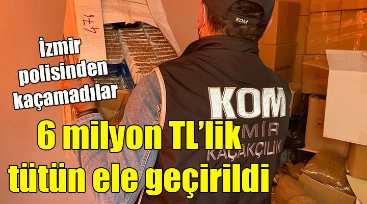 İl Emniyet Müdürlüğü'ne bağlı Kaçakçılık Suçlarıyla Mücadele Şube Müdürlüğü ekipleri, dün Konak'ta bir iş yeri ve depoya operasyon düzenledi. Ekiplerin adreste yaptığı aramada, piyasa değeri yaklaşık 6 milyon lira olduğu değerlendirilen 232 bin kaçak bandrolsüz ve fotokopi bandrollü makaron, 210 bin 100 sarma sigara, 165 paket gümrük kaçağı pipo tütünü, 15 kilo nargile melası, 16 kilo badrolsüz kıyılmış tütün ve 50 kilo açık kıyılmış tütün ele geçirildi. Operasyonda 2 kişi gözaltına alındı. Şüphelilerin emniyetteki işlemlerinin sürdüğü öğrenildi.