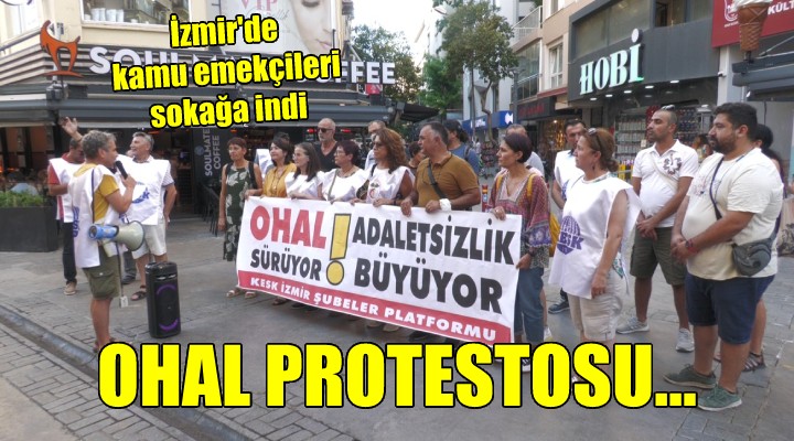 SONKALEİZMİR- Kamu Emekçileri Sendikaları Konfederasyonu'nun (KESK) tüm Türkiye’de başlattığı adalet nöbetleri kapsamında Alsancak Kıbrıs Şehitleri Caddesi'nde bulunan Türkan Saylan Kültür Merkezi önünde toplanan kamu emekçileri, OHAL sürecinde yaşananları protesto etti. “OHAL Sürüyor, Adaletsizlik Büyüyor” yazılı pankart açan KESK üyeleri, “KHK’lar gidecek biz kalacağız”, “İşimizi geri alacağız”, "Sermayeye değil emekçiye bütçe”, "Direne direne kazanacağız”, "Gezi gelecek tek adam gidecek” sloganları attı. Protestoya, HDP İzmir Milletvekili Serpil Kemalbay Pekgözegü'nün yanı sıra İzmir Tabip Odası Yönetimi Kurulu üyeleri de destek verdi.