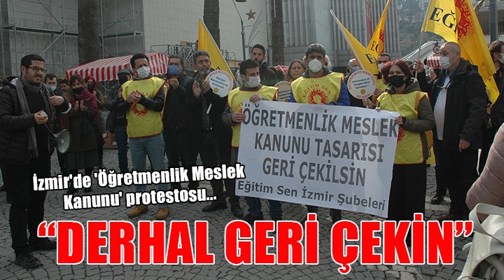 SONKALEİZMİR-İzmir Konak'ta toplanan eğitim çalışanları, Öğretmenlik Meslek Kanunu'nun geri çekilmesi için hükümete çağrı yaptı. "Çalışma barışını bozacak", "Kariyer basamaklarını getirecek" ve "Haklarımızı ve taleplerimizi içermiyor" yazılı dövizler taşıyan öğretmenler, "Hükümet yasanı al, başına çal", "Zafer direnen emekçinin olacak", "Birleşe birleşe kazanacağız" sloganları attı.