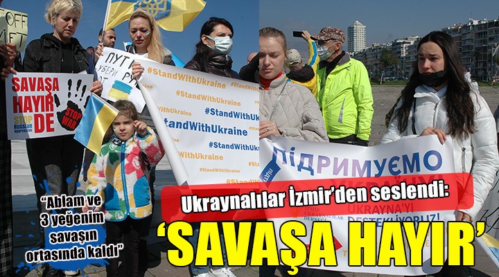SONKALEİZMİR-İzmir Gündoğdu Meydanı'nda toplanan Ukraynalılar, ellerinde bayraklarla ve taşıdıkları dövizlerle 'Savaşa hayır' eylemi yaptı. Türkiye ve Ukrayna milli marşlarını okuyan Ukraynalılar, sloganlar atıp müdahalenin durdurulması için dünya ülkelerine çağrı yaptı.
