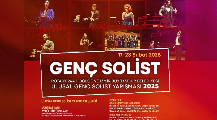 İzmir Büyükşehir Belediyesi, Rotary Bölge 2440 ve Dokuz Eylül Üniversitesi Devlet Konservatuvarı iş birliği ile 17-23 Şubat tarihlerinde Ulusal Genç Solist Yarışması düzenlenecek. İzmir Büyükşehir Belediyesi Ahmed Adnan Saygun Sanat Merkezi’nde (AASSM) yapılacak bu önemli yarışmayla genç opera solistlerinin hem sanatseverlere tanıtılması hem de Türkiye ve dünyadaki sanat kurumlarının kapılarını aralama olanaklarını bulması amaçlanıyor. Önemli isimlerin yer aldığı jüri, şehir dışından ve Kuzey Kıbrıs Türk Cumhuriyeti’nden (KKTC) gelen 102 genç sanatçı arasından seçim yapacak. İki ayrı kategoride düzenlenecek yarışmada, final bölümü halka açık ve ücretsiz olacak.