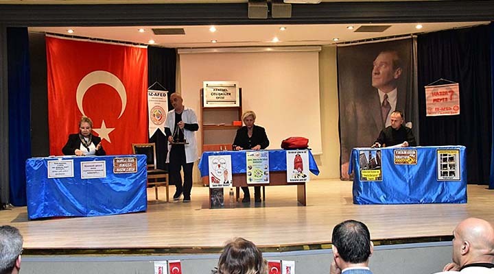 İZ-AFED üyeleri, afetler olmadan önce alınması gereken önlemleri, bu kez Dokuz Eylül Üniversitesi (DEÜ) İktisadi ve İdari Bilimler Fakültesi Dr. Ömer Yiğitbaşı Konferans Salonu'nda sahneledikleri gösteriyle anlattı. Yaklaşık 15 dakika süren 'Kentsel Çelişkiler Ofisi' adlı oyunda afetlerle ilgili kavramlar hatırlatılarak doğru bilinen yanlışlara dikkat çekildi. Afet yönetimi alanında farklı kurumlarda yaklaşık 20 yıl görev yapıp, İl Afet ve Acil Durum Müdürlüğü'nden emekli olan İZ-AFED'in kurucusu Servet Ertaş, bu oyunu 3'üncü kez sahnelediklerini belirtti. 17 Ağustos depreminin yıl dönümünde Kültürpark Gençlik Tiyatrosu'nda, 30 Ekim depreminin yıl dönümünde Türkan Saylan Kültür Merkezi'nde sahneledikleri oyunu 3'üncü kez izleyiciyle buluşturduklarını söyleyen Ertaş, "Yıllardır afet eğitimleri veriyorum. AFAD'dan emekli afet bilinci eğitmeniyim. Klasik salon eğitimleri ve seminerlerin bir süre sonra insanları sıkmaya başladığını fark ettik. Teknik bilgiler fazla ilgi çekmiyor. Yöntemi değiştirmeye karar verdik. Bunları komedi ve mizah kullanarak tiyatroda anlatalım, dedik" ifadelerini kullandı. Yaklaşık 15 dakikalık kısa oyunu kendisinin kaleme aldığını anlatan Ertaş, "Amacımız toplumda afetle ilgili doğru sanılan yanlışlara mizahi açıdan yaklaşmak. Kulaktan dolma sözler vardır. Deprem olduğunda eşik altında durmak, pencereden balkondan atlamak doğru sanılır. Biz bu yanlışlara dikkat çekmek istedik. Afetlerle ilgili kavramların her birine dokunduk. Eğitim vermiyoruz. Böyle bir amacımız yok. Konuları, kavramları dile getirip farkındalık oluşturuyoruz" diye konuştu.