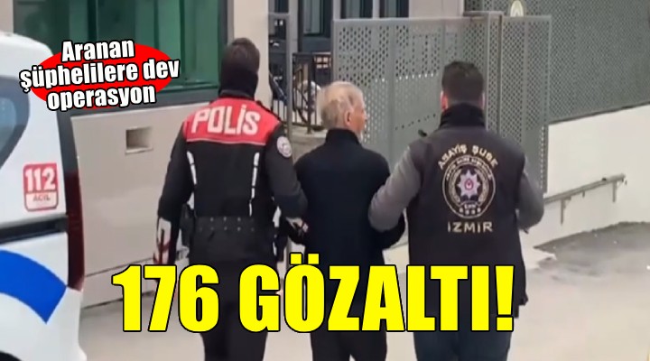 İzmir İl Emniyet Müdürlüğü ekipleri, kentin güvenliğini ve huzurunu sağlamak için hakkında kesinleşmiş hapis cezası bulunan ve aranan şüphelilere yönelik operasyon düzenledi. 281 polisin katılımı ile yapılan operasyonda, 110 adrese eş zamanlı baskın yapıldı. 'Hırsızlık, silahla yağma, kişiyi hürriyetinden yoksun kılma, kasten yaralama, uyuşturucu madde ticareti yapma/kullanma, dolandırıcılık, görevi yaptırmamak için direnme' gibi çeşitli suçlardan aranması olan 176 şüpheli gözaltına alındı. 24 saat süren operasyonun dün saat 06.00'da başladığı bildirildi. Yapılan aramalarda ise 1 kuru sıkı tabanca, 1 pompalı tüfek, 1 bıçak ele geçirildi. 24 saat süren operasyonun dün saat 06.30'da başladığı bildirildi.