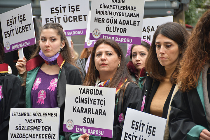 SONKALEİZMİR-İzmir Barosu önünde toplanan avukatlar, kadın haklarını anlatan broşürler dağıttı. Alsancak Kıbrıs Şehitleri Caddesi'nde "Kadın dayanışması yaşatır", "Nafaka hakkıma dokunma", "Eşit işe eşit ücret", "Şekli değil, gerçek eşitlik" yazılı dövizlerle yürüyen avukatlar, "İstanbul Sözleşmesi yaşatır", "Susmuyoruz, korkmuyoruz, itaat etmiyoruz" sloganları attı.