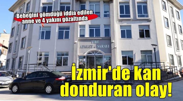 Olay, Tire ilçesi kırsal Sarılar Mahallesi'nde meydana geldi. Hatice D.'nin, evlilik dışı dünyaya getirdiği bebeğini çuvala koyarak köprü altına gömdüğü öne sürüldü. Dün gelen ihbar ve Hatice D.'nin yakınlarının şikayetiyle, Tire Cumhuriyet Başsavcılığı tarafından çalışma başlatıldı. Jandarma arama köpeği, söz konusu bölgede arama yaptı ancak herhangi bir sonuca ulaşılamadı. Hatice D.'nin evinde yapılan aramada ise üzerinde 'kan izi' olduğu değerlendirilen çamaşırlar bulundu. Bunun üzerine bugün, Hatice D. ile 4 yakını daha gözaltına alındı. 5 şüphelinin işlemlerinin sürdüğü bildirildi.