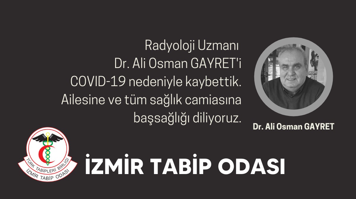 SONKALEİZMİR- Pandemiyle mücadelede ön saflarda yer alan doktorlardan birinin daha can vermesi İzmir'de büyük üzüntü yarattı. İzmir Tabip Odası, "Radyoloji Uzmanı Dr. Ali Osman GAYRET'i COVID-19 nedeniyle kaybettik. Ailesine ve tüm sağlık camiasına başsağlığı diliyoruz" açıklamasını yaptı.