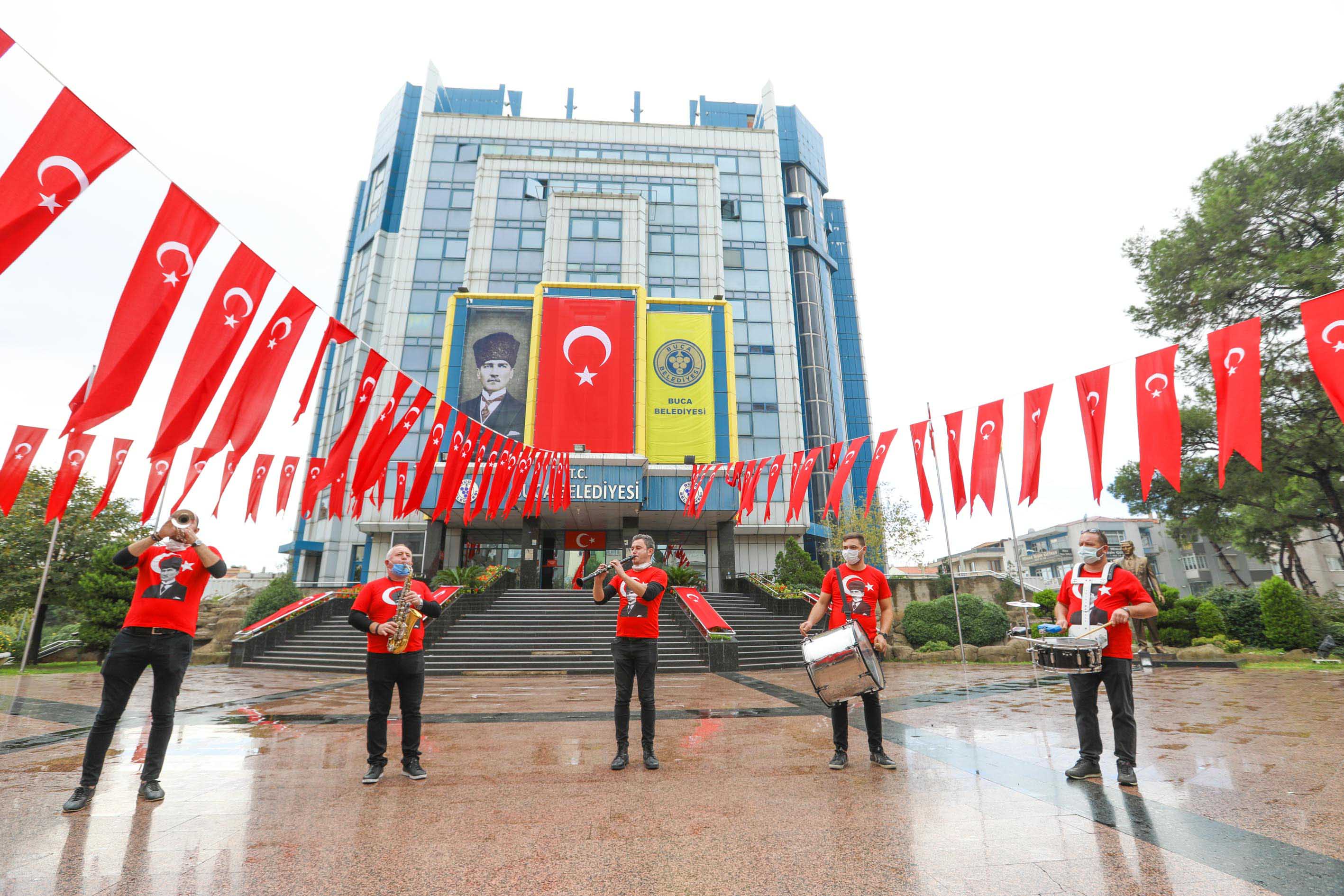 Belediyesi Bando Ekibi eşliğinde belediye binası önünden Buca sokaklarını dolaştı. 10’nuncu yıl marşı, İzmir