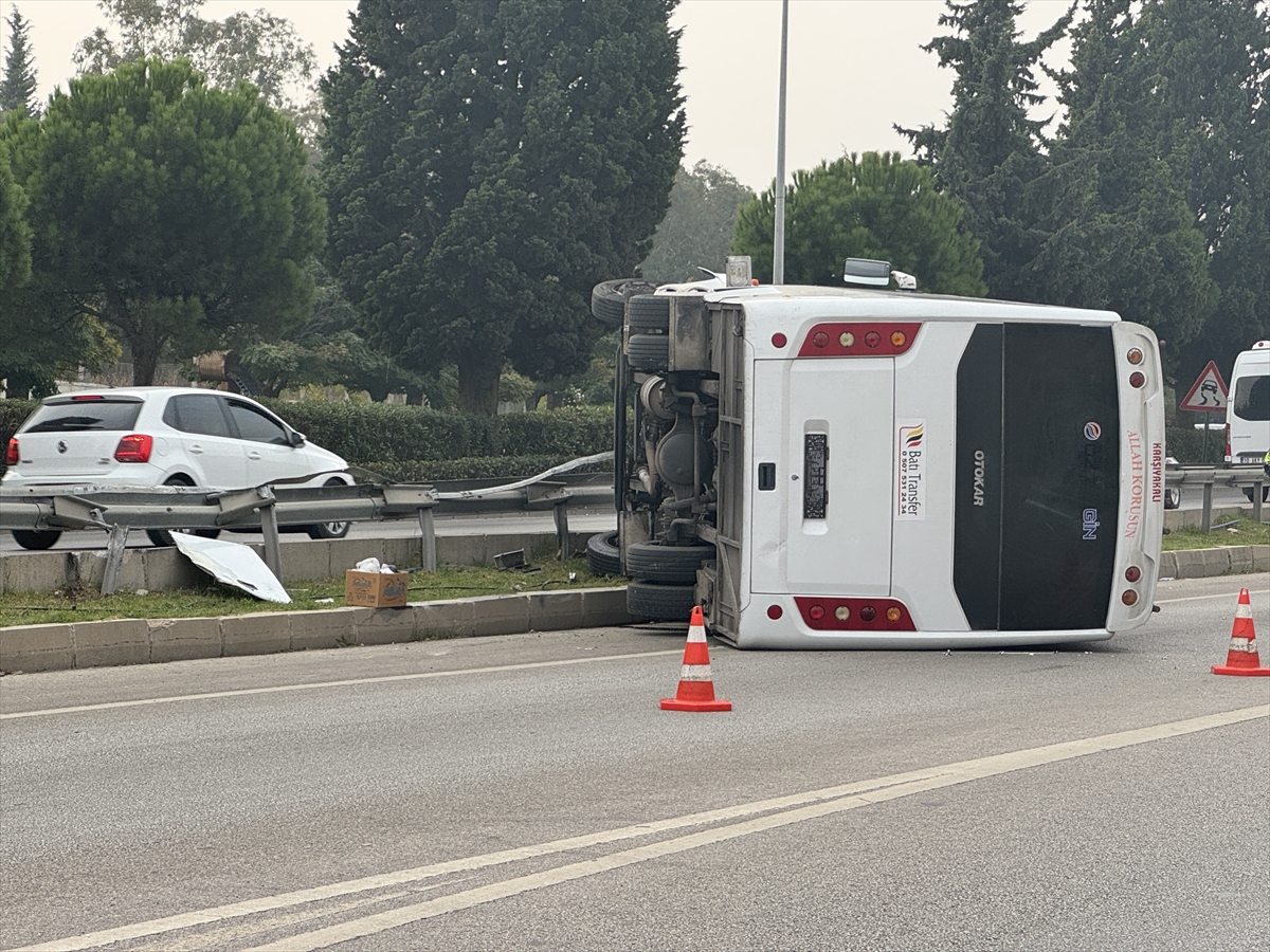 H.B. (57) idaresindeki, İzmir Adnan Menderes Havalimanı personelini taşıyan plakası henüz öğrenilemeyen midibüs, Menderes Caddesi'nde refüje çarpıp devrildi.