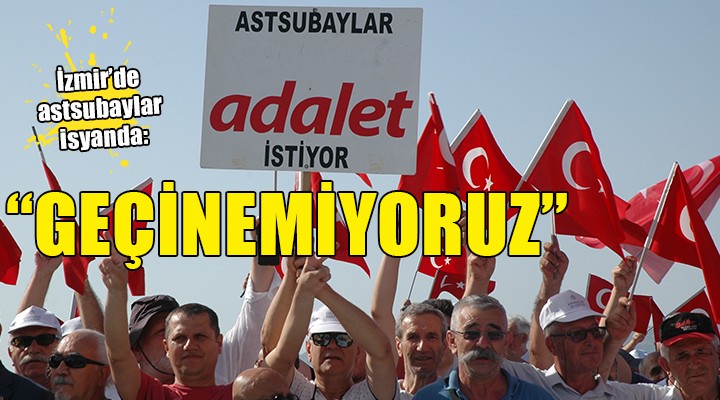 "Astsubaylar hak ve adalet peşinde", "Huzur hakkı değil, helal tazminat hakkımızı istiyoruz" yazılı pankartlar açan astsubaylar, "Hak, hukuk, adalet", "İstikamet Ankara" sloganları attı. Emekli astsubaylara CHP İzmir Milletvekili Kani Beko, CHP ve İYİ Parti il ve Konak ilçe yöneticileri ve sivil toplum örgütlerinin temsilcileri destek verdi.