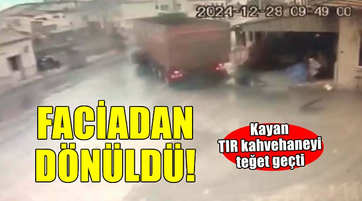 Olay, geçen yıl 28 Aralık'ta, Yeniçiftlik Mahallesi'nde meydana geldi. Tire-İzmir kara yolunda bir TIR, yağmurun kayganlaştırdığı yolda sürücüsünün kontrolünden çıktı. Kayarak ilerleyen TIR'ın savrulan dorsesi yol kenarındaki kahvehanenin pergolasını sıyırıp teğet geçti. O anlar çevredeki iş yerinin güvenlik kameralarına yansıdı. TIR'ın dorsesinin kahvehanenin önündeki pergolayı sıyırması, altında oturan 3 kişinin kaçmakla durmak arasında kalışı ve pergolanın altındaki köpeğin ise koşarak uzaklaşması görüntülerde yer aldı.