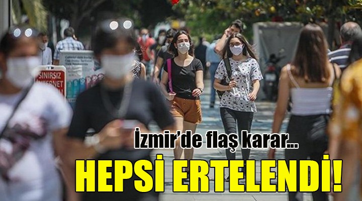 İzmir Valiliği'nden yapılan açıklamada, İzmir İl Hıfzısıhha Kurulunun yaptığı toplantıda yeni kararların alındığı belirtildi. Açıklamada, "Kovid-19'a bağlı olarak vaka artışlarının fazla olması sebebiyle, fiziksel teması önleyerek bulaşma riskini azaltmak amacıyla milli günler ve mahalli kurtuluş günü kutlama törenleri dışında yapılacak her türlü sosyal etkinliklerin ileri bir tarihe ertelenmesine karar verilmiştir." ifadelerine yer verildi.