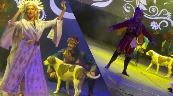 Sokak köpeğin sahnedeki oyuncuları tek tek dolaşarak koklaması kameralara yansıdı.