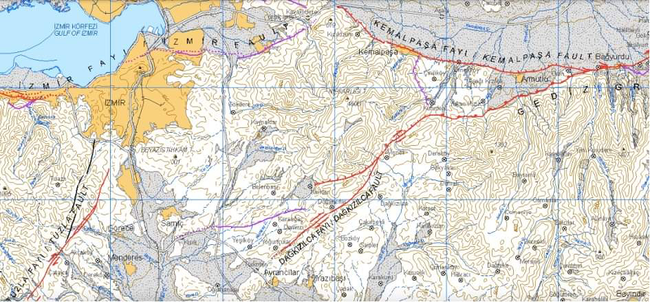"İzmir kent ortasında deprem yapacak iki tane ana kırık vardır. Bunlardan en önemlisi Denizli-Pamukkale'den doğru Gediz Göçüntü güneyinden, Bozdağ kuzey kıyısı boyunca Sarıgöl, Alaşehir, Salihli, Ahmetli, Urganlı, Torbalı, Kemalpaşa, Bornova üzerinden gelen Gediz düşüntülü(normal faulting) Kırığıdır.Bu kırık, Turgutlu-Urganlı-Derbent'te çatallaşır. Manisa üzerinden giden kuzey koluna Manisa Kırığı, güney koluna Kemalpaşa Kırığı denir. Manisa kırığı, Gediz Göçüntüsünü izleyerek Manisa üzerinden giderken Karadağ(Split) ile Yamanlar Dağının kuzey sınırından Menemen-Foça'ya doğru uzanır. Çatalın güney kolu olan Kemalpaşa(İzmir) kırığı da Gediz Göçüntüsünün bir parçası olan Kemalpaşa Göçüntü alanının güneyinden Nif Dağının kuzey kıyılarını yalayarak İzmir'e doğru yönelir. Bu kırık da Kavaklıdere-Yeşilçay'a kadar tek kolla gelirken, Bağyurdu'nda Dağkızılca kırığıyla kesişir."