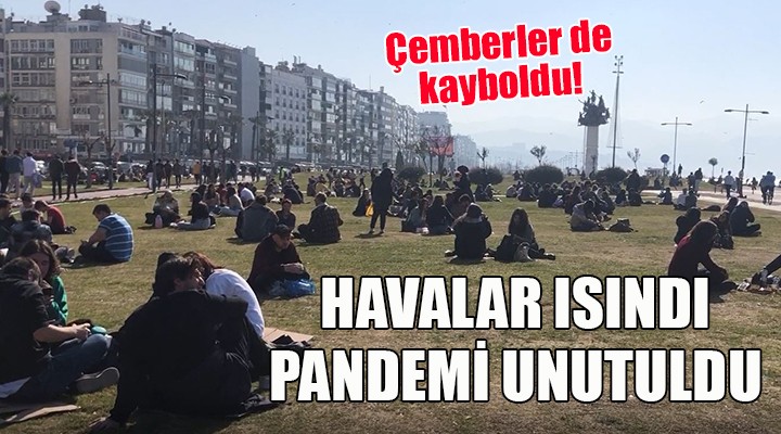 İkbal Erkan/SONKALEİZMİR-İzmir'de güzel havayı fırsat bilen yurttaşlar kendilerini sahil kenarına atarken, pandemi unutuldu. Alsancak Kordon'da yoğun kalabalık oluşurken, maske takmayan birçok kişinin sosyal mesafe kuralına da uymadığı görüldü. Koronavirüs tedbirleri kapsamında sadece paket servise açık olan mekanlar bomboş dururken, yiyeceğini içeceğini alan sahile koştu. Restoranlarda oturamayan gençler çimler üzerinde sosyal mesafesiz şekilde güneşin ve sohbetin tadını çıkardı. İzmir Büyükşehir Belediyesi'nin pandemide sosyal mesafe kuralına uyulması amacıyla sahil bölgelerinde çimler üzerine çizdirdiği çemberlerin de koybolduğu gözlendi.