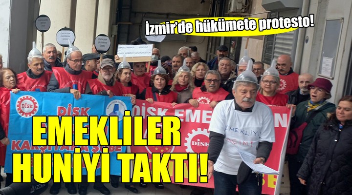 SONKALEİZMİR-DİSK Emekli Sen, emeklilere yapılan maaş zam oranlarını protesto etmek için sahaya indi. Konak eski Sümerbank önünde toplanan emekliler, kafalarına huni takıp hükümeti protesto etti. "Emekliler çıldırmak üzere", "Emeklilere refah payı" yazılı dövizler taşıyan emekliler basın açıklaması yaparak taleplerini sıraladı. Açıklama şöyle: