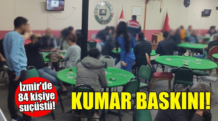 İzmir İl Jandarma Komutanlığı ekipleri, huzur ve güven uygulaması gerçekleştirdi. Jandarma ekipleri tarafından bir çok adrese eş zamanlı gerçekleştirilen baskınlarda, umuma açık işletmelerde kumar oynayan 84 kişi yakalandı.