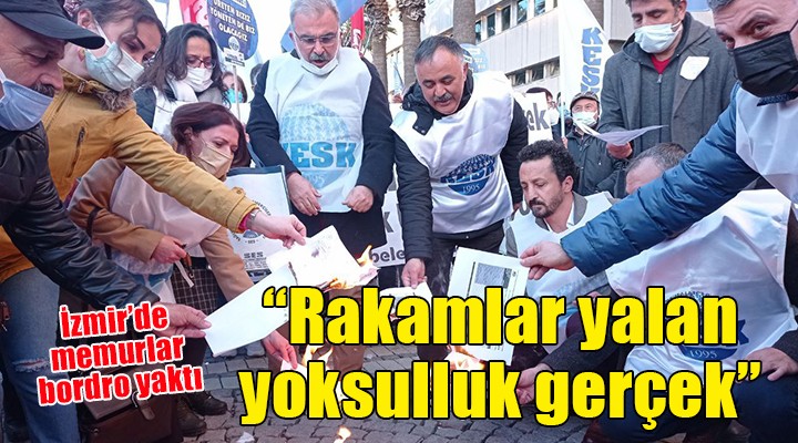 SONKALEİZMİR-İzmir'de Konak Meydanı'nda toplanan memurlar art arda gelen zamları bordrolarını yakarak protesto etti. İnsanca yaşayacak bir ücret istiyoruz" sloganı atan memurlar, geçinemediklerini belirterek AKP hükümetine tepki gösterdi.