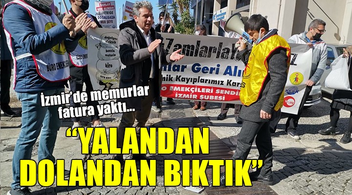 SONKALEİZMİR-KESK'e bağlı Büro Emekçileri Sendikası (BES) İzmir Şubesi üyesi memurlar, bugün kentin 4 farklı noktasında fatura yakarak hükümete tepki gösterdi. Konak'ta SGK İzmir İl Müdürlüğü binası önünde, "Bu zamlarla yaşanmaz, zamlar geri alınsın" yazılı pankart açan memurlar, eş zamanlı olarak Çiğli Yamanlar Vergi Dairesi, Bornova İŞKUR ve Gaziemir Vergi Dairesi önünde de zamları protesto etti.