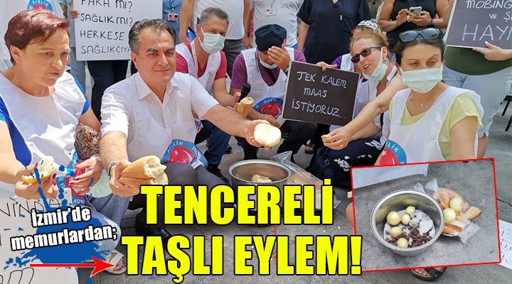 SONKALEİZMİR-Memur ve memur emeklilerinin maaş ve aylıklarına 2022 ve 2023 yıllarında yapılacak zammın belirleneceği 6. Dönem Toplu Sözleşme görüşmeleri başlarken, İzmir'de dikkat çeken bir eylem yapıldı. Birlik Sağlık Sen'e bağlı memurlar, İzmir'in Konak ilçesine bağlı Alsancak semtinde "Memur taş mı yesin" sloganıyla sokağa inerken, tencereye taş koyup ekmek soğan yiyerek hükümete seslendi.