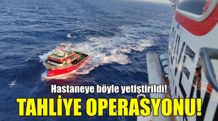 Helikopterle gemiye inen ekip, rahatsızlanan kişiyi Ege Üniversitesi Hastanesi'ne intikal ettirdi.