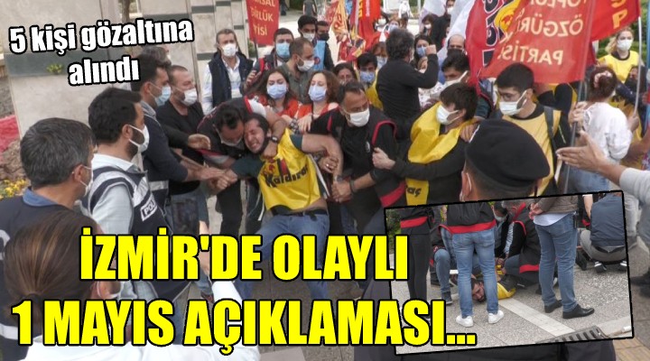 SONKALEİZMİR-Devrimci İşçi Sendikaları Konfederasyonu (DİSK), Kamu Emekçi Sendikaları Konfederasyonu (KESK), Türk Mühendis ve Mimar Odaları Birliği (TMMOB), Türk Tabipler Birliği (TTB), İzmir Barosu ve İzmir Tabip Odası tarafından düzenlenen 1 Mayıs İşçi ve Emekçi Bayramı açıklaması öncesi yürüyüş gerginliği yaşandı. Açıklamanın yapılacağı Konak Meydanı'na sahil tarafından yürümek isteyen bir gruba polis müdahale etti. Yaşanan arbedede 5 kişi gözaltına alındı. HDP İzmir Milletvekili Murat Çepni ve sendika temsilcilerinin girişimleri sonucu olaylar daha fazla büyümeden önlenirken, Konak Meydanı Kemeraltı girişinde yüzlerce kişinin katılımıyla basın açıklaması yapıldı.