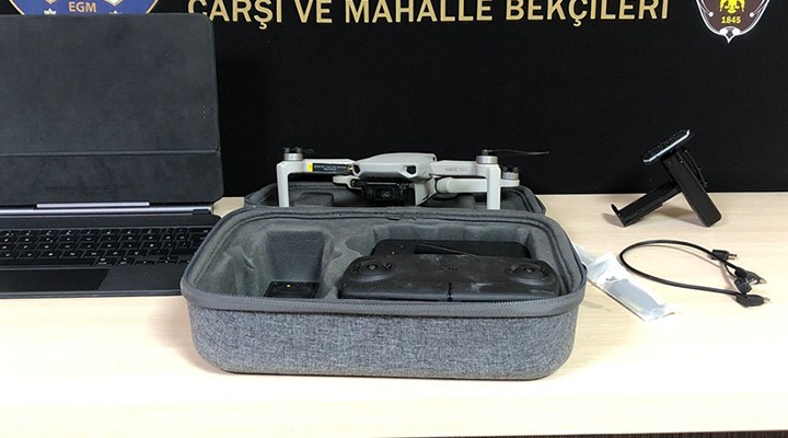 Şüphelinin elindeki poşette yapılan incelemede, dron ve parçaları, garaj anahtarı, klavye ve kaşe tespit edildi.