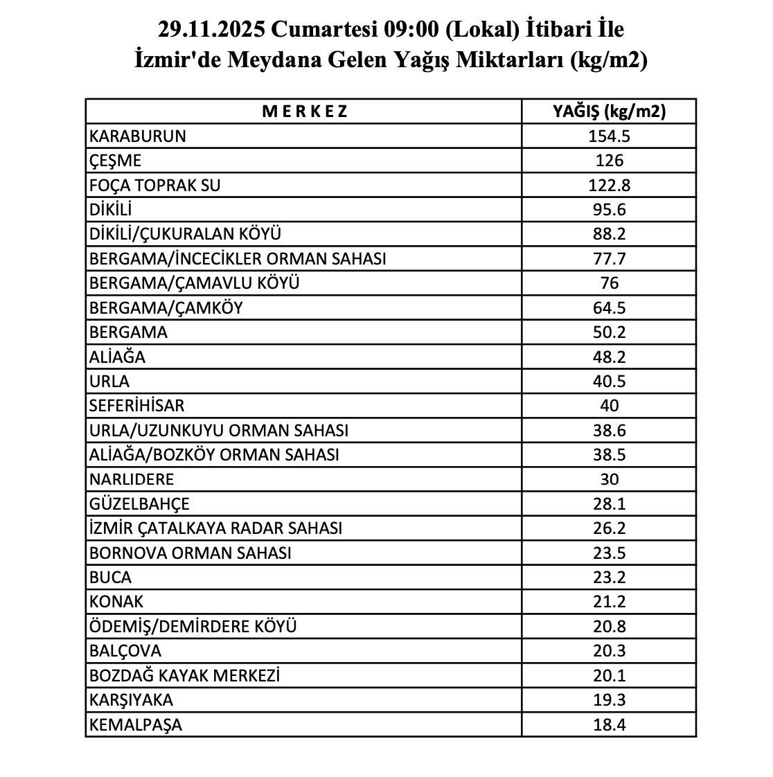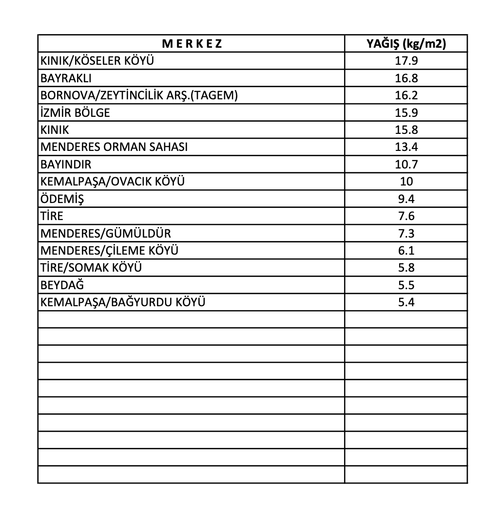 Meteoroloji Bölge Müdürlüğü'nedn açıklanan yağış miktarları şu şekilde: