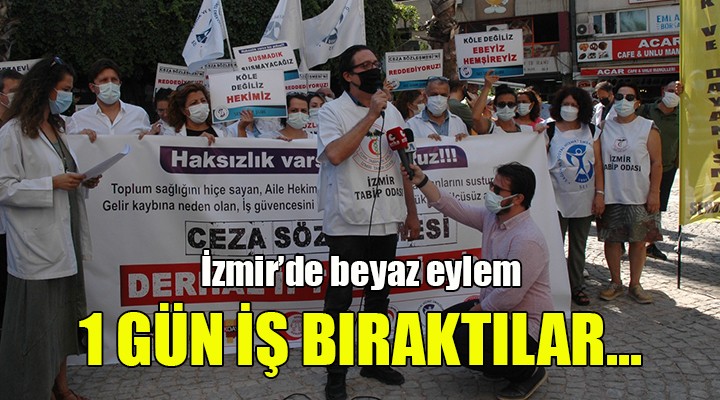 Tüm Türkiye'de iş bırakma eylemi kararı alan sağlıkçılar, İzmir'de "Ceza sözleşmesini reddediyoruz", "Maaşıma el koyabilirsin ama ruhuma asla", "Bu sözleşme hak gaspıdır" yazılı dövizlerle hükümete tepki gösterdi. İzmir Tabip Odası Genel Sekreteri Nuri Seha Yüksel, Aile Hekimliği Sözleşme ve Ödeme Yönetmeliği ile çalışma huzurunun da ortadan kalktığını öne sürerek, "Pandemide çok sıkıntı dönemler yaşadık, kaybettiklerimiz oldu.. Halk alkışlarla bizi destekledi ama yönetim sıkıntıları görmezden geldi. Son yönetmelikle de sahipsiz olduğumuzu yeniden gördük" dedi.