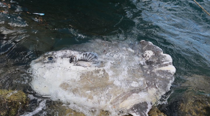 Foça'da, bugün gezi teknelerinin bağlı olduğu sahile giden vatandaşlar, kıyıya vurmuş, yaklaşık 1 metre uzunluğunda ve 35 kilo ağırlığında ay balığı ölüsüyle karşılaştı. Durumun bildirilmesi üzerine sahile gelen Foça Tarım ve Orman İlçe Müdürlüğü Su Ürünleri ekipleri, ölü ay balığını incelemek üzere götürdü. Balığın dün akşamki fırtınanın etkisi ile açık denizden sahile sürüklendiği tahmin ediliyor.