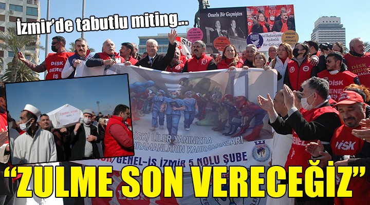 Alana farklı noktalardan sloganlarla yürüyen işçiler, "Güvenceli çalışmak insanca yaşamak için taşerona son", "Özgürlük ve demokrasi mücadelesinde emekli olunmaz", "Geçinemiyoruz, vergide gelirde adalet istiyoruz’ yazılı pankartlar açtı. İşçiler, miting alanına üzerinde "Zamma, zulme son" yazılı tabut getirirken, mizansenli tepkide imam görünümlü bir kişi ile kefen giyen iki kişi de yer aldı.