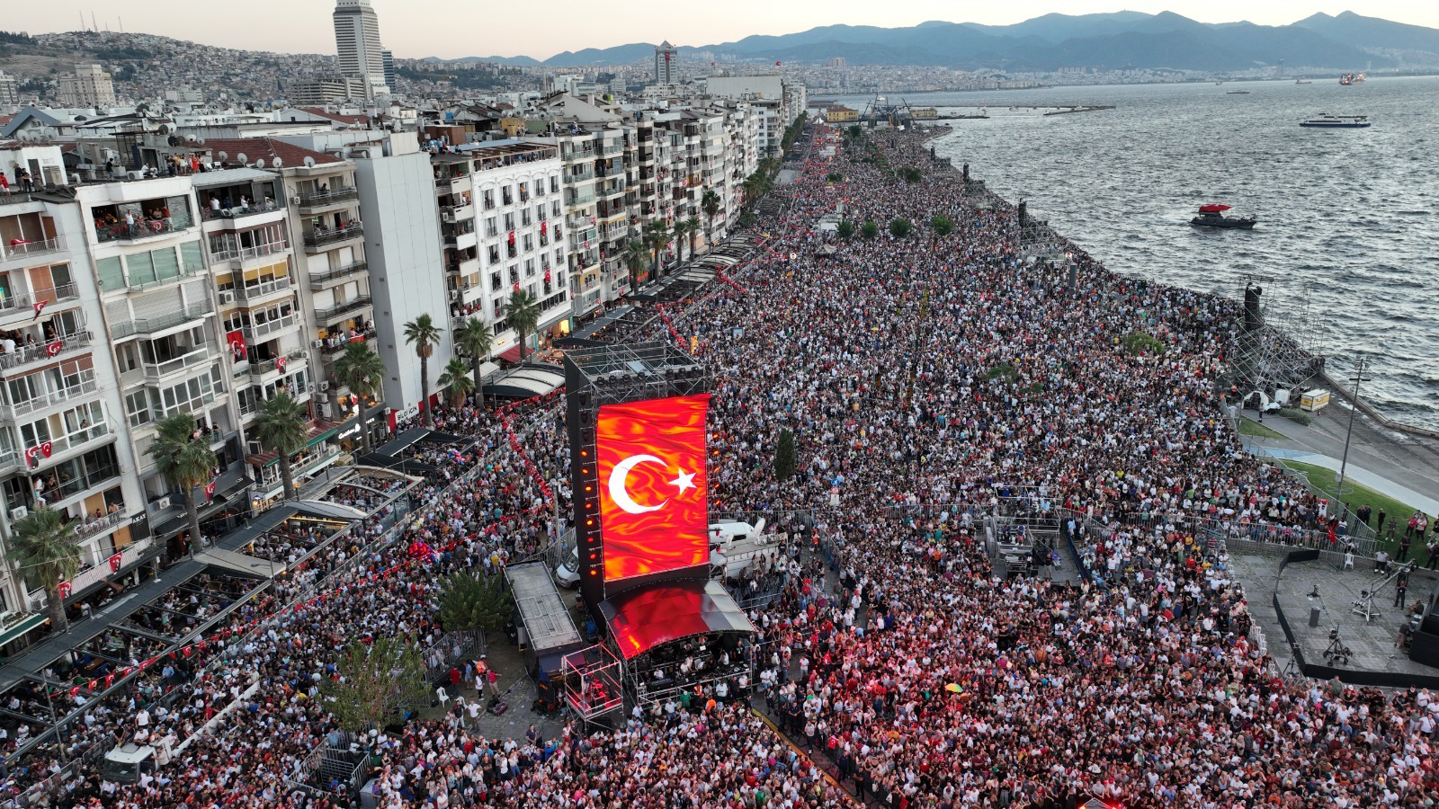 Kutlamalar kapsamında arttırılmış gerçeklikle desteklenen "İşgalden Kurtuluşa İzmir" adlı özel tiyatral gösteri ve saat 22.00'de başlayacak Tarkan konseri için İzmirliler, Kordonboyu'na akın etmeye devam ediyor.