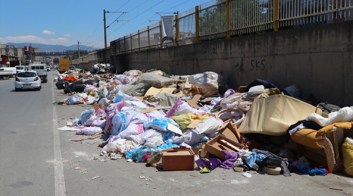 Toplanmayan sanayi atığı sünger, kumaş, sunta gibi malzemelerin metrelerce yola taştığı görüldü. Yola ve kaldırıma taşan atıkların toplanmaması kirliliğe yol açtı.