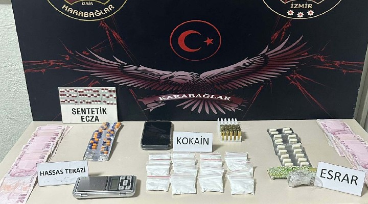 Karabağlar İlçe Emniyet Müdürlüğü ekipleri, 'uyuşturucu madde ticareti ile mücadele' kapsamında çalışma yaptı. Bu kapsamda takibe alınan U.T. ve sevgilisi B.I.'nın uyuşturucu sattığı belirlendi. Şüphelilerin otomobili, önceki gün durdurulup arandı. Ekiplerin aramasında 18 parça halinde paketlenmiş 92,20 gram kokain, hassas terazi, 67 uyuşturucu hap, 4,90 gram esrar, 25 tabanca mermisi ve 7 bin 800 TL ele geçirildi.