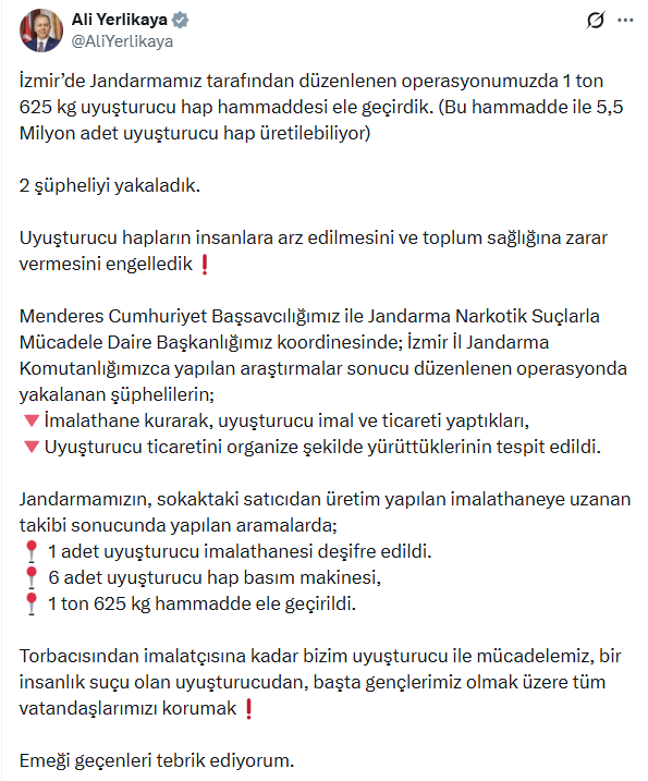 Ali Yerlikaya, sosyal medya hesabından yaptığı paylaşımda, İzmir'de jandarmanın düzenlediği operasyona ilişkin bilgi verdi. Yerlikaya, "Uyuşturucu hapların insanlara arz edilmesini ve toplum sağlığına zarar vermesini engelledik" dedi.