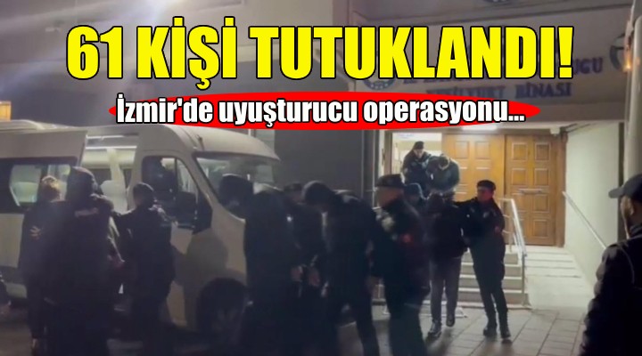 İzmir İl Emniyet Müdürlüğü Narkotik Suçlarla Mücadele Şube Müdürlüğü ekipleri, uyuşturucu satıcılarına yönelik çalışma yaptı. Yaklaşık 3 ay süren takibin ardından 15 Ocak sabahı operasyon düzenlendi. Özel harekat polisinin destek verdiği, 200 polisin katılımıyla şüphelilerin ev ve iş yerlerine düzenlenen helikopter destekli operasyonda 84 kişi gözaltına alındı. Haklarında gözaltı kararı verilen 23 şüphelinin ise çeşitli suçlardan cezaevinde oldukları belirlendi. Narkotik köpeklerinin de kullandığı şüphelilerin üzerleri ile ev, iş yeri ve eklentilerindeki aramalarda bir miktar esrar, metamfetamin ve uyuşturucu hap, ruhsatsız 7 tabanca, 6 pompalı tüfek, 1 kılıç, 84 tabanca/tüfek fişeği ve hassas terazi ele geçirildi.