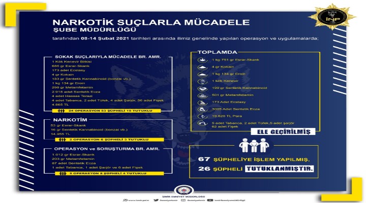 İzmir Narkotik Suçlarla Mücadele Şube Müdürlüğü ekipleri, kentte uyuşturucu madde imalatı veya ticareti yapan şüphelilere yönelik çalışma başlattı. Bu kapsamda 8 Şubat -14 Şubat tarihleri arasında yapılan uygulamalarda, 1 kilo 751 gram esrar-shank, 4 gram kokain, 1 kilo 134 gram eroin, 1 kök kenevin, 199 gram sentetik kannabinoid, 501 gram metanfetamin, 173 ekstazi, 3 bin 5 sentetik ecza hap, 19 bin 820 lira nakit para, 5 tabanca, 2 tüfek ile 5 şarjör ve 62 fişek ele geçirildi. Ele geçerelin uyuşturucu ve silahlarla ilgili gözaltına alınan 67 şüpheliden 26 kişi mahkemece tutuklandı.