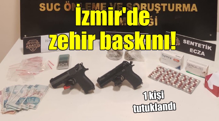 Buca İlçe Emniyet Müdürlüğünce, uyuşturucu madde ticareti ve üretiminin önlenmesine yönelik yapılan çalışmalarda; ilçede K.D.B. isimli kişinin uyuşturucu ticareti yaptığı belirlendi. Bunun üzerine teknik ve fiziki takip başlatan polis, Cumhuriyet Savcılığının talimatı ile şüphelinin evine baskın yaptı. Evde yapılan aramada, bir miktar esrar maddesi, 1 hassas terazi, 56 yeşil reçeteye tabi hap, 2 ruhsatsız tabanca ve çok sayıda şeffaf kilitli poşet ele geçirildi. Gözaltına alınan şüpheli, emniyetteki işlemlerinin ardından sevk edildiği adliyede tutuklandı.