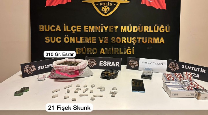 Buca İlçe Emniyet Müdürlüğü Suç Önleme ve Soruşturma Büro ekipleri, uyuşturucuyla mücadele kapsamında alınan bir bilgi üzerine harekete geçti. Polis ekiplerince belirlenen bir eve düzenlenen operasyonda 310 gram esrar, 21 adet içime hazır skunk maddesi, 61 adet uyuşturucu hap ile 1 adet hassas terazi ele geçirildi. Olayla ilgili gözaltına alınan E.Y., işlemlerinin ardından sevk edildiği adliyede tutuklandı.