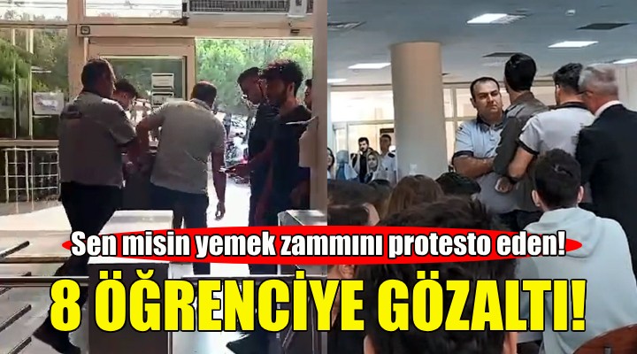 Dokuz Eylül Üniversitesi'ndeki yemekhanedeki protestoda güvenlik görevlileri tarafından yaka paça dışarı çıkartılarak polise teslim edilen 8 üniversite öğrencisinin ise gözaltına alındığı bilgisine ulaşıldı.